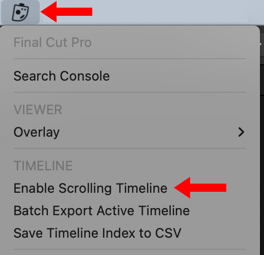 Fortunately, the scrolling timeline is also off in CommandPost (red arrows above). To turn it on, select Enable Scrolling Timeline. To turn it off, deselect it. This screen shot shows it disabled.