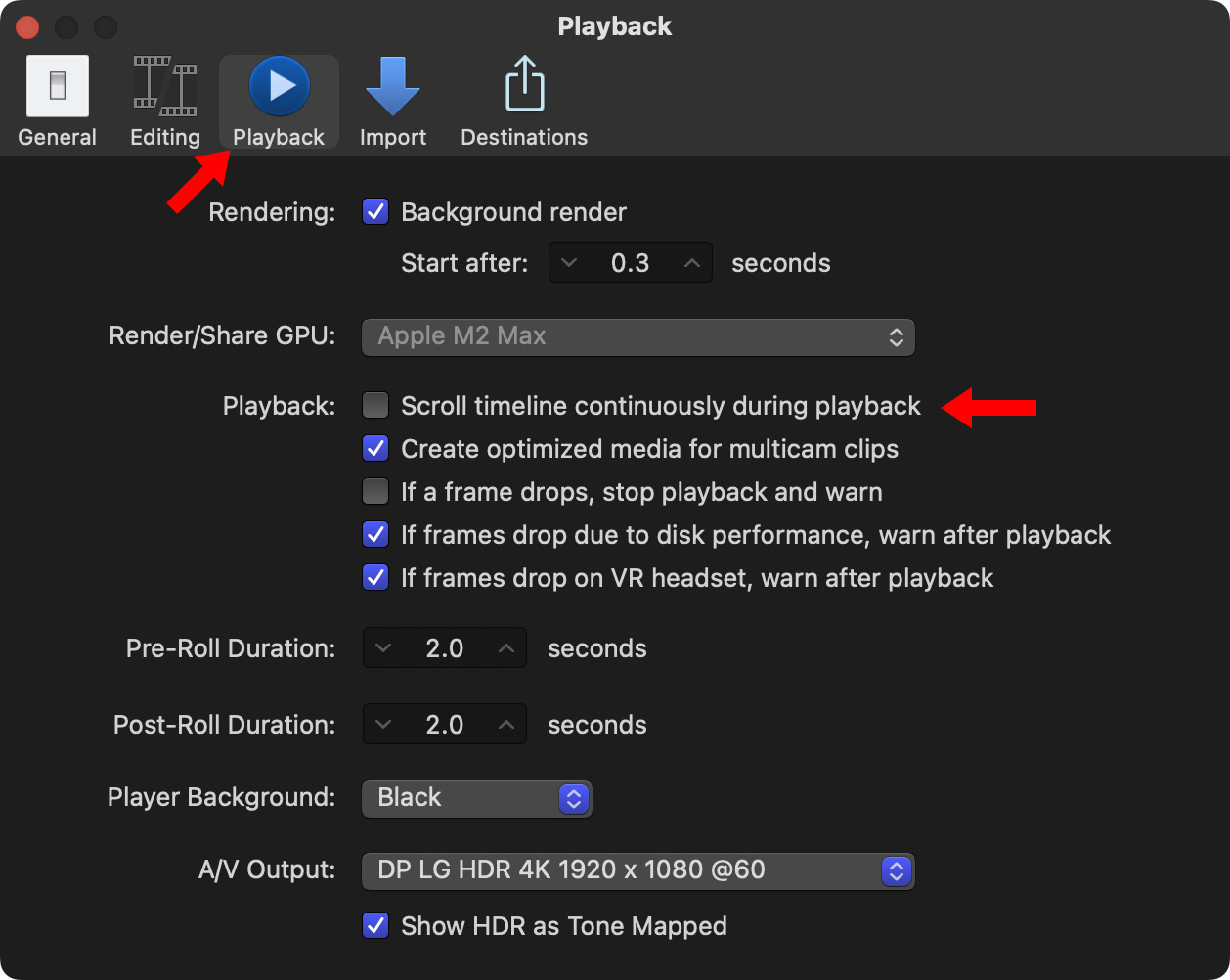 Fortunately, the scrolling timeline is also off in CommandPost (red arrows above). To turn it on, select Enable Scrolling Timeline. To turn it off, deselect it. This screen shot shows it disabled.