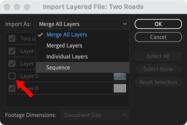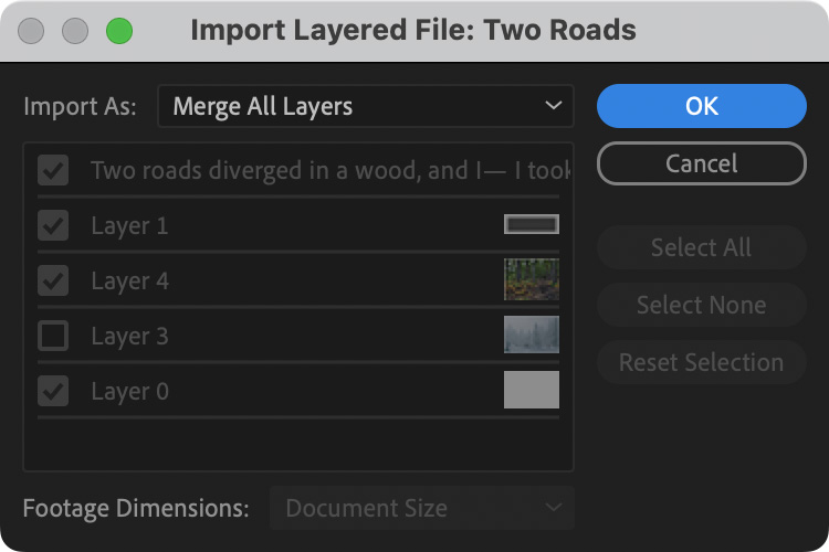 NOTE: Selecting Merged Layers allows you to select which layers to import into that single, merged graphic. You can even import inactive layers, which makes them active (enabled) in Premiere.