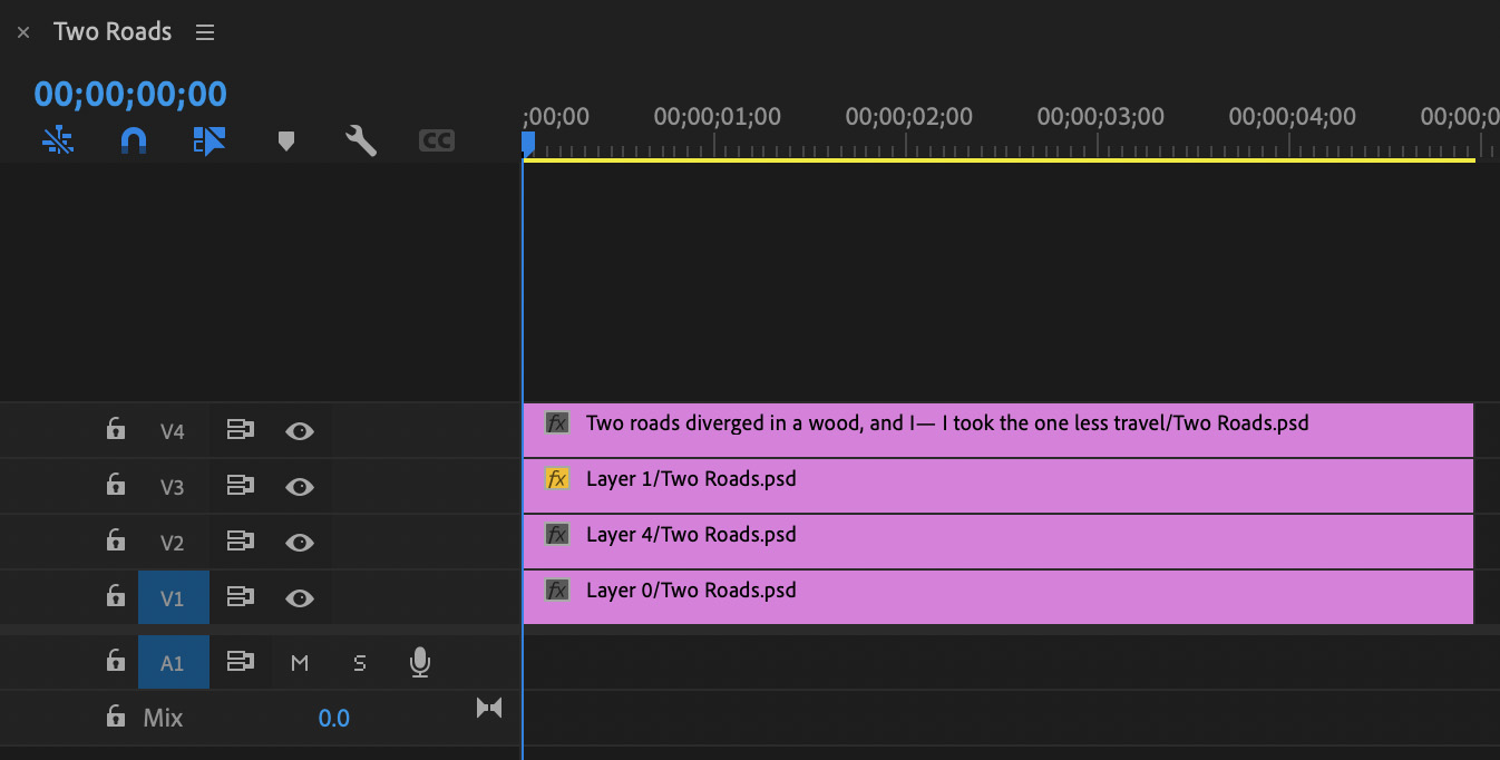 However, note that only four layers were imported! Premiere does not import any layer that is hidden in Photoshop, unless you manually override that setting. Every import option except Merge All Layers allows these overrides. Once a layer is imported as an individual clip, changing layer order or names in Photoshop won’t be reflected in Premiere. Layer organization is set upon first import.