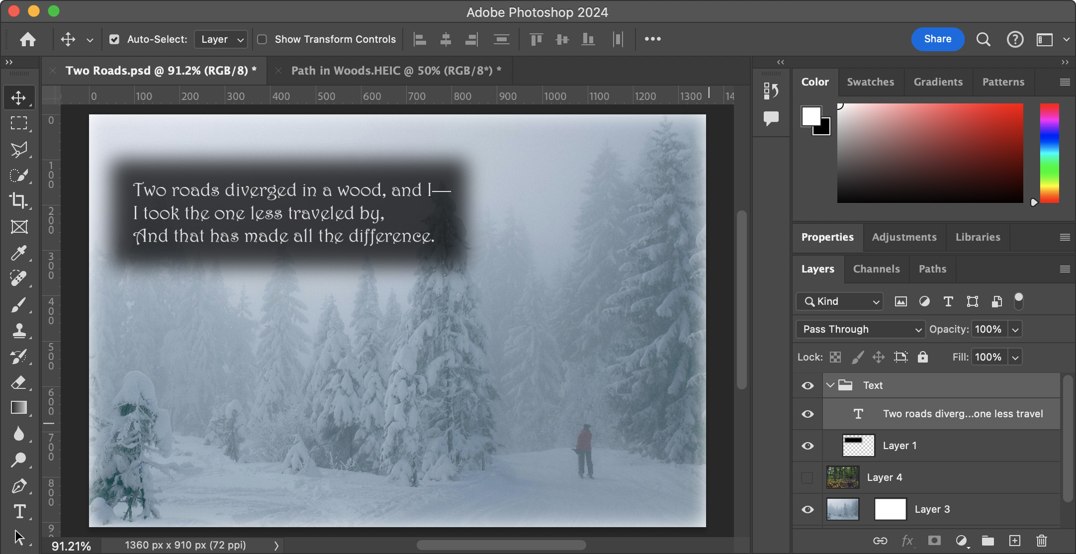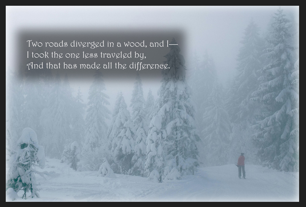 Here, for instance, I enabled the winter layer and moved the text. Poof! Instant update. Note, also, that the darkness of the rectangle matches that in Photoshop.