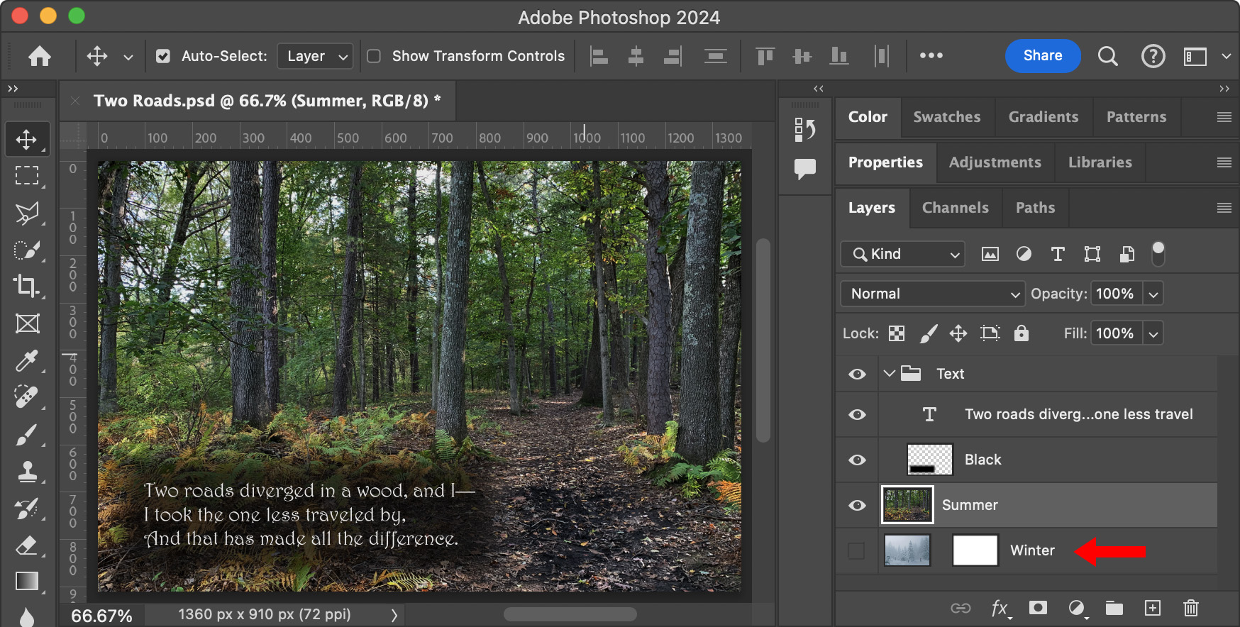 Here, for instance, I enabled the winter layer and moved the text. Poof! Instant update. Note, also, that the darkness of the rectangle matches that in Photoshop.