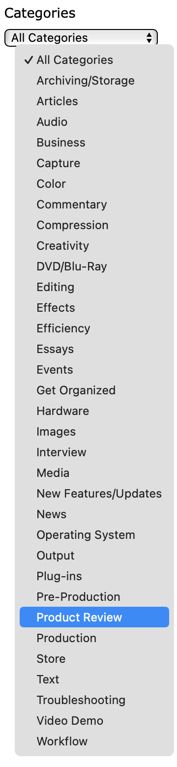 Click the Categories menu to filter all tutorials to a specific subject. I’ve written a lot of tutorials about the same subject, for example, Editing, Color grading, or Audio.