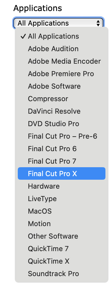 Click the Applications menu to filter all tutorials to specific software, hardware-only, or the macOS.