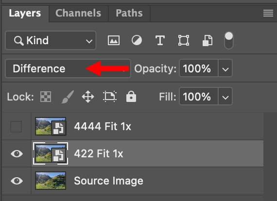 Finally, I took each set of images back into Photoshop and compared them to the original using the Difference blend mode. Difference highlights differences in both color and grayscale. All images were processed in Photoshop at 100%. They are displayed here at a reduced size, but you can see the full size by clicking an image.