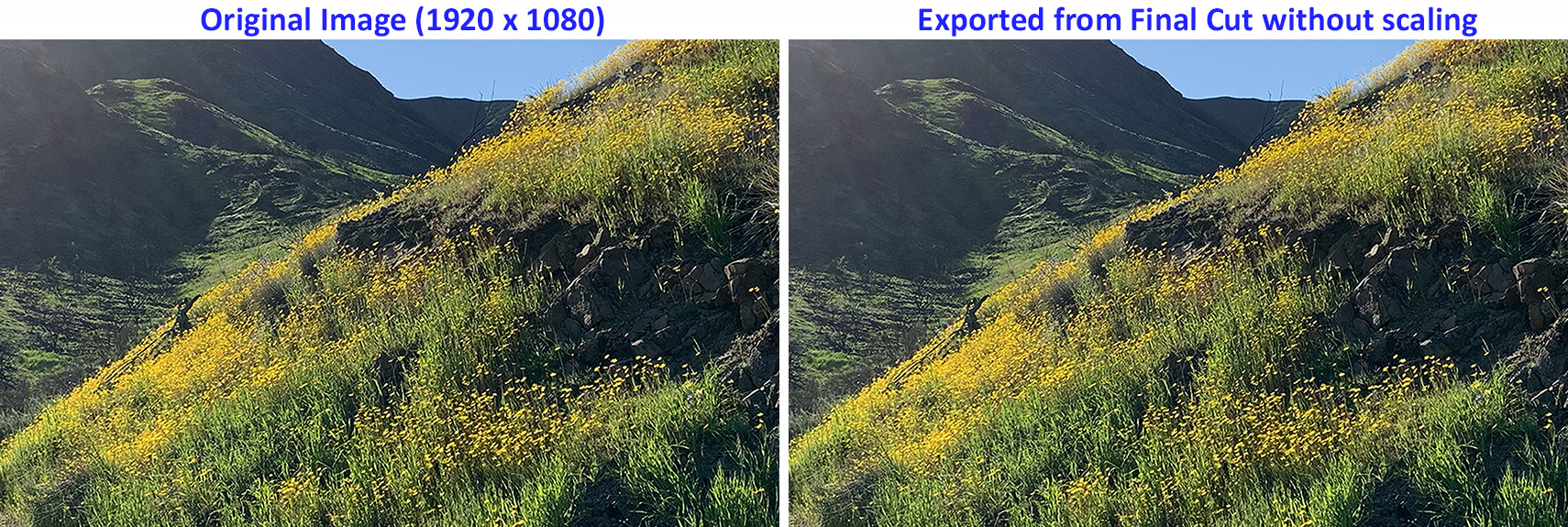 First, I compared the visual look of the original 1920 x 1080 image to one exported without scaling from Final Cut. Whether put into a ProRes 422 or 4444 timeline, the exported image look identical to the source. There are no image artifacts created when exporting an image scaled to the same size as the timeline when measured using Difference.