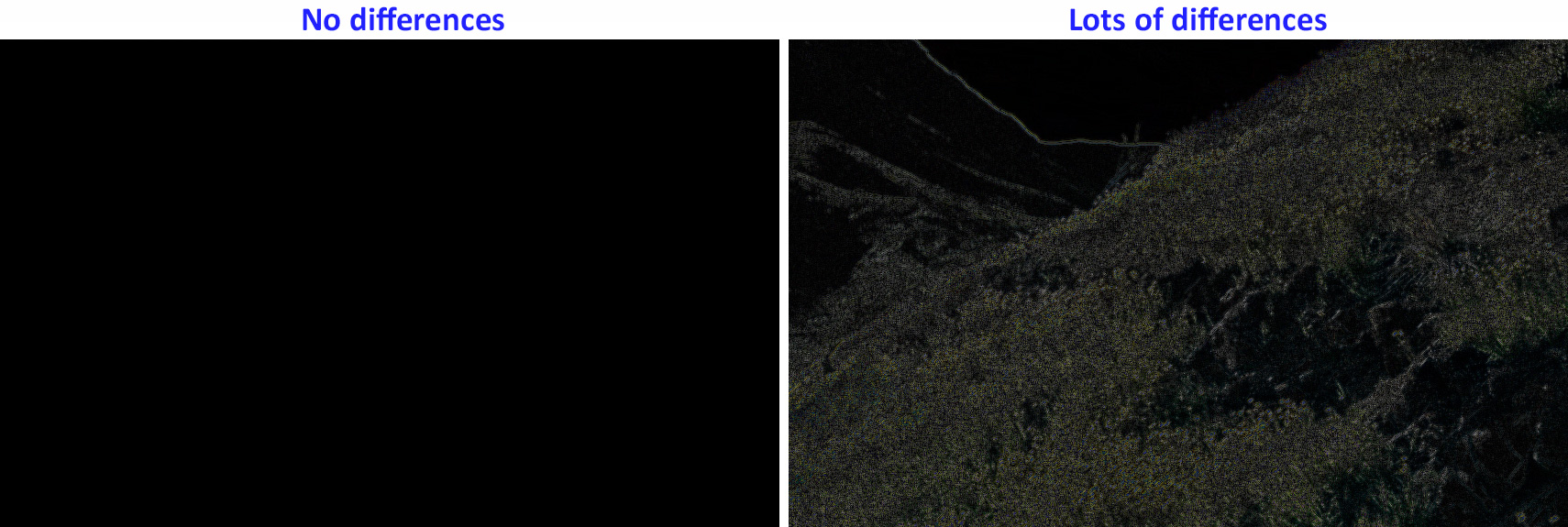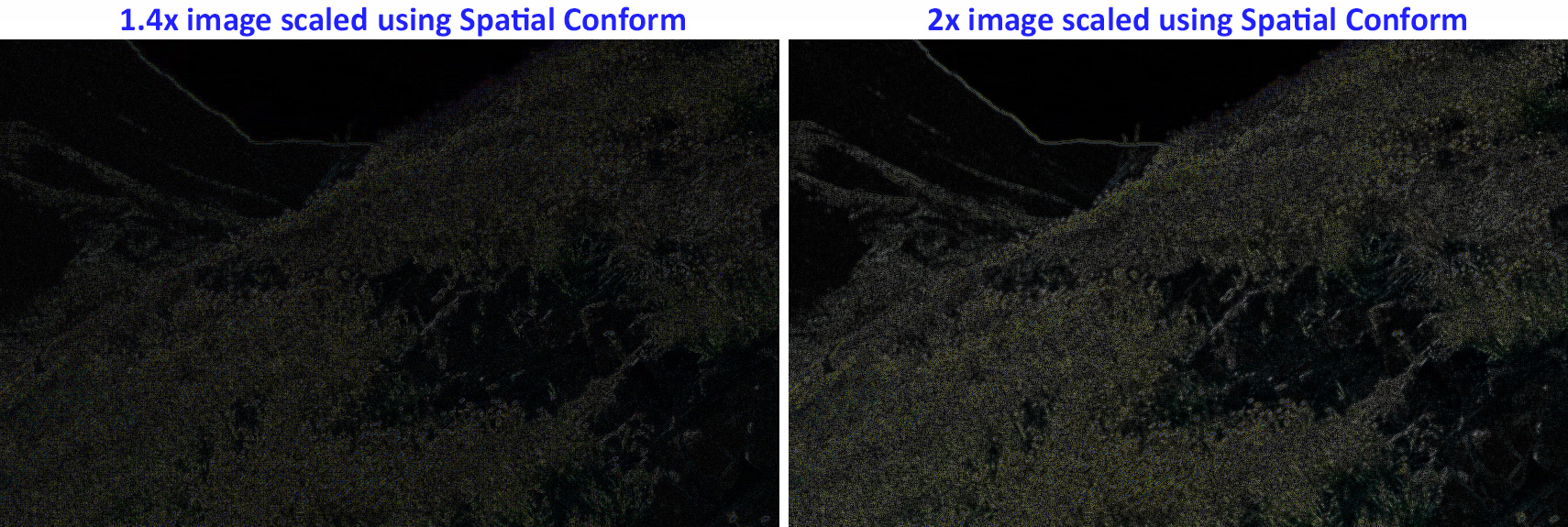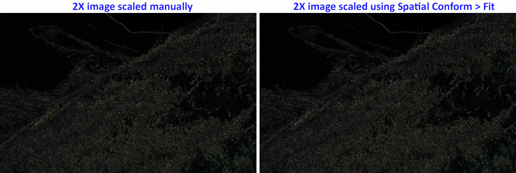 This compares the amount of change introduced based on the size of the timeline image to an unscaled clip. The less an image is scaled, the closer the image quality matches the source image. Two perfectly matched images would be solid black. Here, the brighter artifacts on the right indicates more differences because a larger 2x clip is scaled more than the smaller 1.4x clip on the left.