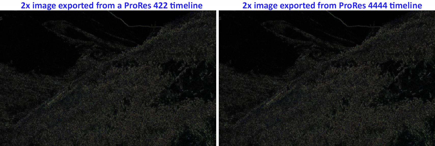 This compares differences when exporting the 2X image (which shows the most artifacts) from a rendered ProRes 422 vs. ProRes 4444 timeline. When compared using Difference, there are no differences between exporting stills from a 422 or 4444 timeline, but there are differences created by the scaling itself.