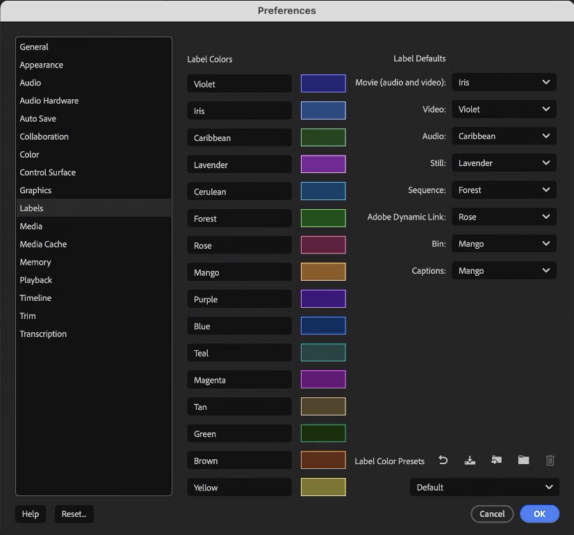Use label color presets to select, name, and share your project’s unique label colors. Associate colors to label defaults and create a preset you can share with your whole team so you can stay organized together. Plus, when you right-click on an item to apply a new label color, you’ll see a color swatch next to the name.