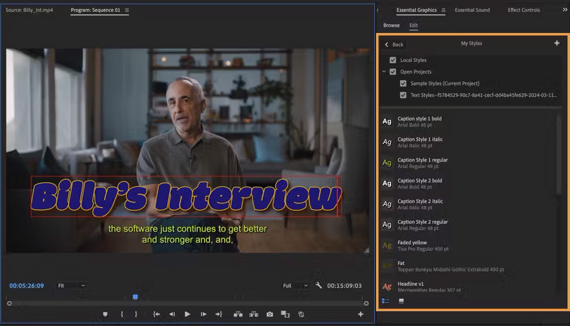 An all-new overhaul of text styling within Premiere Pro introduces thumbnails and a fresh style browser. Seamlessly reuse your favorite styles across multiple projects for a streamlined editing experience like never before.