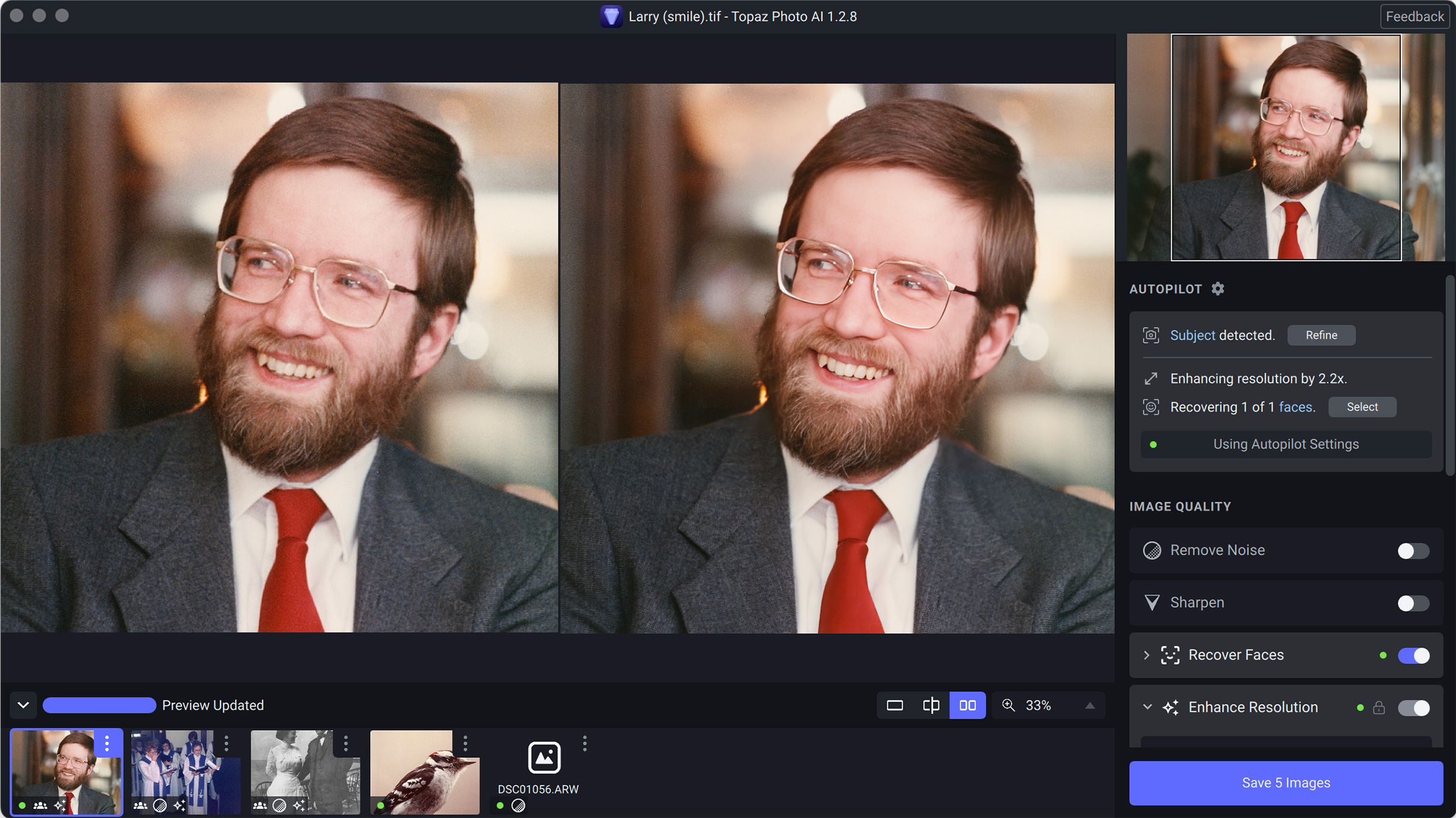 But…! Look at the image on the right in this screen shot. The source image is 300 x 400 pixels.) Look how Photo AI restored the detail in the lace of her dress, smoothed skin texture and restored individual strands of hair. The resulting image is 1200 x 1600 pixels and suitable for printing or display.