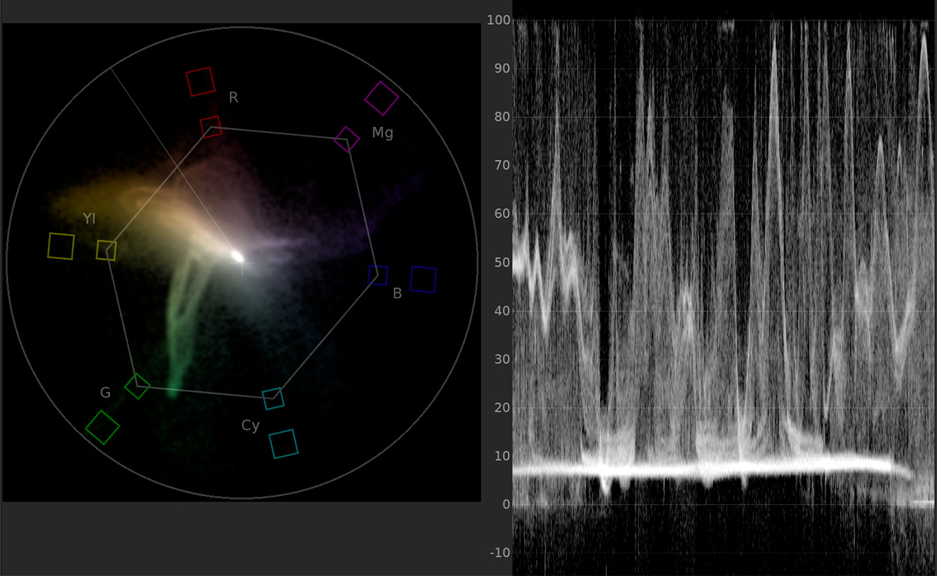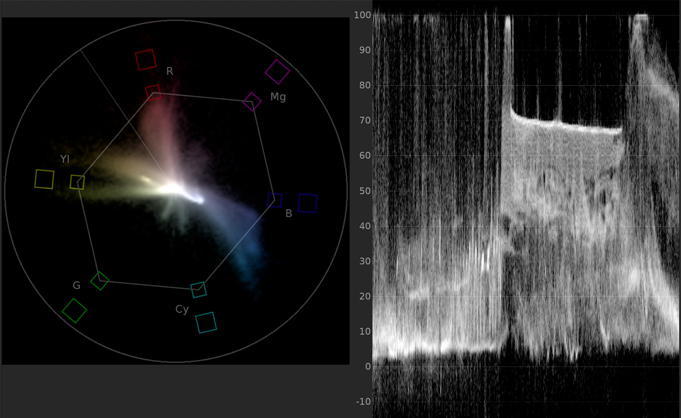 When we look at the scopes, the image is flooded with midtones, highlights and color!