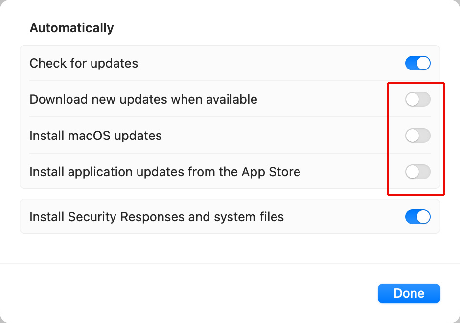 My recommendation is that you leave automatic security updates turned on, but turn off all other updates. Here’s how.